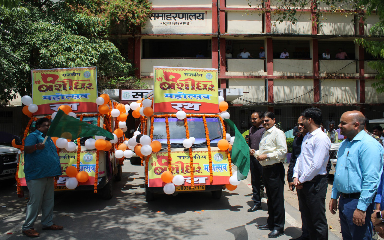 राजकीय महोत्सव के व्यापक प्रचार-प्रसार एवं लोगों तक महोत्सव संबंधित जानकारी पहुंचाने के उद्देश्य से बुधवार को समाहरणालय गढ़वा परिसर से उपायुक्त शेखर जमुआर एवं उप विकास आयुक्त राजेश कुमार राय द्वारा हरी झंडी दिखाकर दो रथों को रवाना किया गया. मालूम हो कि राजकीय महोत्सव के लिए विशेषकर यह रथ रवाना किए गए हैं. ये दोनों रथ जिले के विभिन्न प्रखंडों में जाकर लोगों को महोत्सव से संबंधित जानकारी देंगे एवं महोत्सव से जुड़े प्रचार-प्रसार करने का कार्य करेंगे. रथ रवाना करते समय मौके पर मुख्य रूप से निदेशक डीआरडीए दिनेश प्रसाद सुरीन, अनुमंडल पदाधिकारी गढ़वा राज महेश्वरम, अनुमंडल पदाधिकारी श्री बंसीधर नगर आलोक कुमार, स्थापना उप समाहर्ता अरुण उरांव, जिला जन सम्पर्क पदाधिकारी साकेत कुमार पांडेय समेत अन्य पदाधिकारी उपस्थित थे.