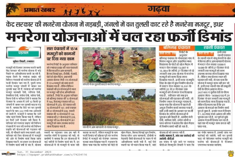 Garhwa News: रमकंडा प्रखंड के विभिन्न पंचायतों में इन दिनों मनरेगा की बिरसा सिंचाई कूप, बिरसा हरित आम बागवानी, टीसीबी व मेड़बंदी जैसी योजनाओं में फर्जी डिमांड के आधार पर कागजों पर मजदूरों के काम करने की आखिरकार पुष्टि हो गयी. मनरेगा से जुड़े प्रखंड कार्यक्रम पदाधिकारी, कनीय अभियंता व विभिन्न पंचायतों के रोजगार सेवक की जांच में 27 योजनाओं में फर्जी डिमांड की पुष्टि हुई है. इस तरह जांच में कागजों पर चल रहे 27 योजनाओं का मस्टर रोल जीरो कर दिया गया. वहीं, मस्टर रोल जीरो होते ही इन योजनाओं में मजदूरी मद की राशि का भुगतान स्वतः रुक गया. उल्लेखनीय है कि प्रभात खबर में पिछले 31 दिसंबर के अंक में मनरेगा योजनाओं में चल रहा फर्जी डिमांड- शीर्षक से खबर प्रकाशित की गयी थी. खबर छपने के बाद बीपीओ सुनील कुमार के निर्देश पर सीएफपी कर्मियों ने इन योजनाओं की जांच की. जांच में डिमांड के अनुरूप निर्माण स्थल पर काम होता नहीं मिला.