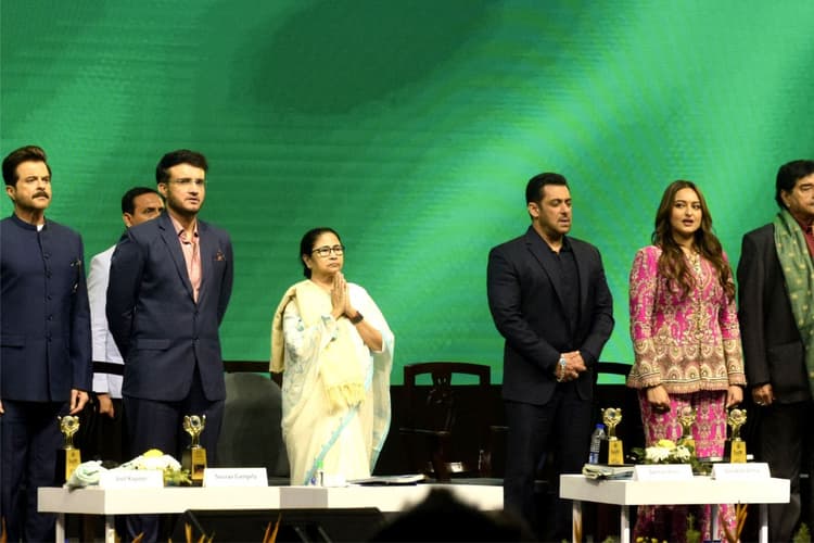 पश्चिम बंगाल की राजधानी कोलकाता में 29वें कोलकाता अंतरराष्ट्रीय फिल्म महोत्सव (Kolkata International Film Festival) का शुभारंभ हो गया है. उद्घाटन समारोह में ममता बनर्जी ने ‘बांग्लार माटी बांग्लार जल’ गाना गाया. इसके बाद सलमान खान ने दीप जलाकर फिल्म फेस्टिवल की शुरुआत की. फिल्म फेस्टिवल के उद्घाटन समारोह में सलमान खान, अनिल कपूर, महेश भट्ट, शत्रुघ्न सिन्हा, सोनाक्षी सिन्हा और सौरव गांगुली जैसे सितारे मौजूद रहे. मुख्यमंत्री ममता बनर्जी ने कहा कि भारतीय सिनेमा में बंगाल के सत्यजीत रॉय, ऋत्विक घटक, मृणाल सेन, उत्तम कुमार, सौमित्र चटर्जी के योगदान को कभी नहीं भुलाया जा सकता. कई राज्यों का अपना संगीत है, लेकिन पश्चिम बंगाल में जन्मे संगीतकारों व फिल्मों का अपना महत्व है. बांग्ला सिनेमा की भाषा धर्म व जाति से ऊपर है और सीधे लोगों के दिलों को छूती है.