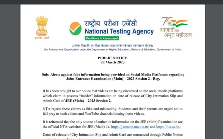 नेशनल टेस्टिंग एजेंसी, एनटीए ने जेईई एडमिट कार्ड 2023 और परीक्षा शहर को लेकर सोशल मीडिया पर चल रही फर्जी सूचनाओं पर एक महत्वपूर्ण अलर्ट जारी किया है. एजेंसी द्वारा जारी आधिकारिक नोटिस एनटीए जेईई की आधिकारिक साइट jeemain.nta.nic.in पर उपलब्ध है. आधिकारिक नोटिस के अनुसार, सोशल मीडिया प्लेटफॉर्म पर वीडियो प्रसारित किए जा रहे हैं, जो जेईई (मुख्य) – 2023 सत्र 2 के सिटी इंटिमेशन स्लिप और एडमिट कार्ड जारी होने की तारीख पर “अंदरूनी” जानकारी होने का दावा करते हैं.