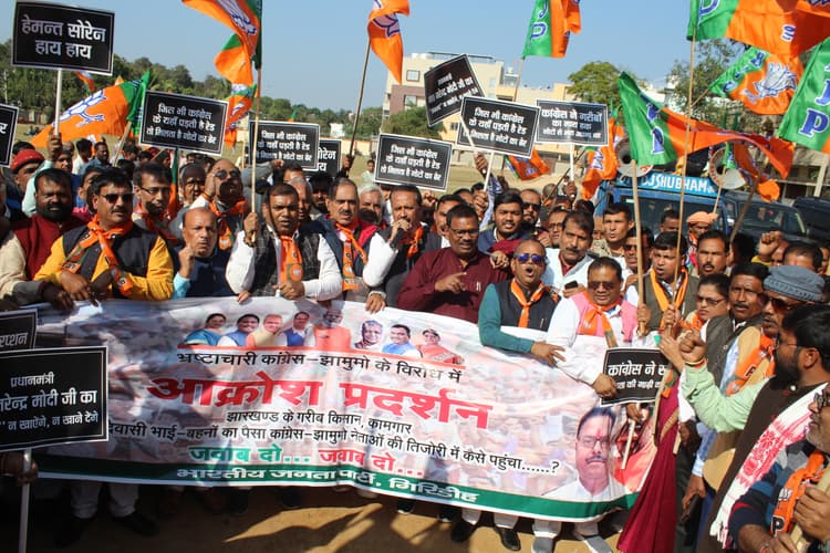 कांग्रेस के राज्य सभा सदस्य धीरज साहू के ठिकानों से करोड़ों रुपये बरामद होने के बाद रविवार को भाजपा ने कांग्रेस-झामुमो गठजोड़ के खिलाफ शहरी क्षेत्र में आक्रोश प्रदर्शन किया. इसका नेतृत्व भाजपा जिलाध्यक्ष महादेव दुबे कर रहे थे. प्रदर्शन सर्कस मैदान से शुरू किया गया जो जेपी चौक, कालीबाड़ी चौक, मुस्लिम बाजार होते हुए बड़ा चौक में समाप्त हुआ. इस दौरान भाजपाइयों ने कांग्रेस और झामुमो के खिलाफ जमकर नारेबाजी की. भाजपा कार्यकर्ता अपने-अपने हाथों में पार्टी झंडा और स्लोगन लिखित तख्तियों को लेकर पैदल चल रहे थे. भाजपाइयों ने हेमंत सरकार को बर्खास्त करने की मांग भी की. झंडा चौक पर आयोजित सभा को संबोधित करते हुए जमुआ विधायक केदार हाजरा ने कहा कि कांग्रेस का इतिहास घोटाले का रहा है. भ्रष्टाचारी कांग्रेस के सहयोग से झारखंड में हेमंत सरकार चल रही है. यूपीए गठबंधन सरकार में जमकर लूट हुई है. उन्होंने कांग्रेस, झामुमो व राजद पर भी जमकर निशाना साधा. साथ ही इस मामले को लेकर धीरज साहू पर मुकदमा दर्ज कर जल्द गिरफ्तारी की मांग की. कहा कि कांग्रेस सांसद के ठिकानों से बरामद रकम गरीबों से लूटा हुआ है. क्योंकि, तीन सौ करोड़ की राशि बरामद होने के बाद कांग्रेस सांसद व यूपीए गठबंधन के नेता मौन धारण किये हुए हैं. इस मामले में इडी को कांग्रेस सांसद और उनके सहयोगियों की जांच कर जेल भेजना चाहिए. कहा कि झामुमो और कांग्रेस परिवादवाद की पार्टी है. हेमंत सरकार ने जनता के साथ वादाखिलाफी की है. मोदी सरकार की गारंटी विकास है. मोदी सरकार गरीबों का विकास कर रही है. विधायक ने कहा कि नल जल योजना में भ्रष्टाचार हावी है. हेमंत सरकार भ्रष्टाचारियों के खिलाफ कोई कार्रवाई नहीं कर रही है. मोदी सरकार की जनकल्याणकारी योजनाओं को राज्य सरकार सही से क्रियान्वित नहीं करवा रही है.