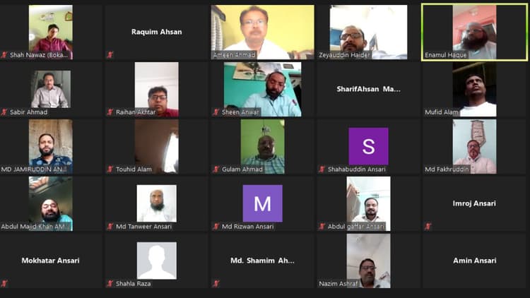 वर्चुअल मीटिंग की अध्यक्षता केंद्रीय अध्यक्ष शरीफ अहसन मज़हरी और संचालन केंद्रीय महासचिव अमीन अहमद ने किया. इस मौके पर मुख्य रूप से नाजिम अशरफ, राकिम अहसन, अब्दुल गफ्फार, साबिर अहमद, शाहनवाज, मोहम्मद रिजवान अंसारी, मोहम्मद शमीम अहमद अंसारी, जियाउद्दीन हैदर, इनामुल हक, खालिदा बेगम, मोहम्मद फखरुद्दीन, तौहीद आलम, वहाब अंसारी, इमरोज अंसारी, मुफीद आलम, रेहान अख्तर, मोहम्मद रिजवान अंसारी, मोहम्मद फखरुद्दीन, मुख्तार अंसारी, अब्दुल मजीद खान, मोहम्मद जमीर उद्दीन अंसारी, तसनीम सबा, गुलाम अहमद, मोहम्मद शहाबुद्दीन, अमीन अंसारी, मकसूद जफर हादी, कमर रशीद, शहला बेगम रजा, अलबाब तराना, मुशाहेदा अंजुम, शीन अनवर आदि शामिल थे.