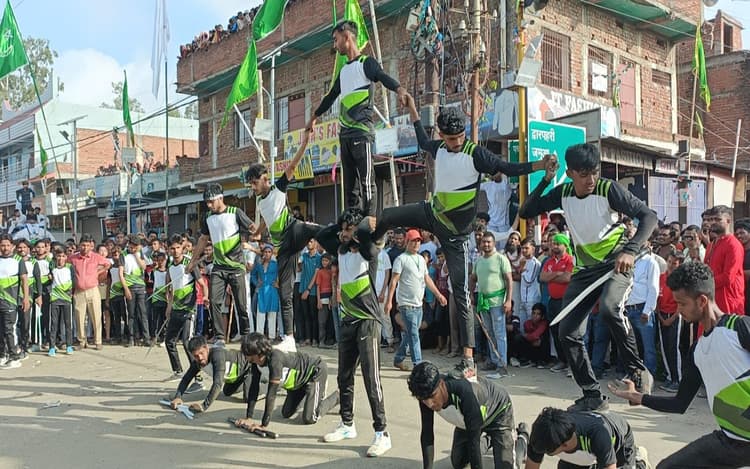 शनिवार की सुबह अखाड़ा जुलूस में शामिल युवाओं की टोली पारंपरिक हथियारों से लैस होकर तलवारबाजी, लाठी, फरसा व सिपल आदि से करतब दिखा रहे थे.