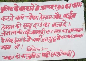 नक्सलियों ने पर्चा में पुलिस मुखबिरी करने वालों का यही अंजाम, पुलिस मुखबिरी करने वाले सावधान हो जाएं जैसे धमकी भरे स्लोगन लिखे हैं. इधर ग्रामीणों द्वारा घटना की सूचना चकाई पुलिस को दी गई. सूचना मिलने के बावजूद चकाई पुलिस सुबह करीब 10 बजे घटनास्थल पर पहुंची. पुलिस ने घटनास्थल से कई खोखा बरामद किये हैं.