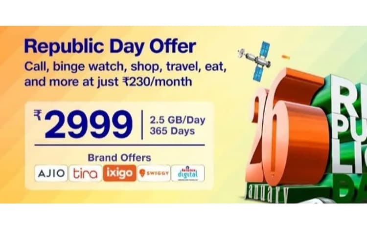 Jio Recharge Plan – अगर आप जियो ग्राहक हैं और इस समय अपने लिए बेस्ट बजट प्लान की खोज में हैं तो यह खबर आपके लिए ही है. आज हम आपको जियो के Republic Day ऑफर प्लान के बारे में जानकारी देने वाले हैं. जियो ने Republic Day ऑफर का ऐलान कर दिया है. इस ऑफर के तहत कंपनी अपने यूजर्स को कई तरह के फायदे रिचार्ज प्लान के साथ दे रही है. इस ऑफर के तहत जियो के 2999 रुपये के रिचार्ज प्लन पर यूजर्स को 3000 रुपये से ज्यादा का बेनिफिट फ्री में मिल रहा है.