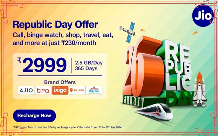 Reliance Jio Republic Day Offer: रिलायंस जियो रिप्बलिक डे के मौके पर ग्राहकों के लिए बेहद खास ऑफर लेकर आया है. इस ऑफर के तहत रीचार्ज कराने वाले यूजर्स को 3 हजार रुपये से अधिक के फायदे होने वाले है. दरअसल जियो कंपनी ने रिपब्लिक डे को लेकर एक नया जियो रिचार्ज प्लान लॉन्च किया है. इस प्लान का नाम Jio Republic Day Offer रखा गया है. आपको बता दें कि इस प्लान को 2999 रुपये में लॉन्च किया गया है. अगर आप इस रिचार्ज को कराते हैं, तो आपको 3 हजार रुपये से अधिक के फायदे मिलने वाले हैं. इस रिचार्ज के जरिए कंपनी ढ़ेर सारा कूपन्स ऑफर कर रही है, जिसका इस्तेमाल आप शॉपिंग, ट्रैवलिंग और खाने-पीने के बिल भरने में कर सकते है. जैसे हीआप इस प्लान का रीचार्ज कराएंगे, इस रिचार्ज में मिलने वाले कूपन आपको तुरंत MyJio ऐप में दिखाई देने लगेगा. आपको जानकारी के लिए बता दें कि इस ऑफर का फायदा आप केवल 31 जनवरी तक उठा सकते है.