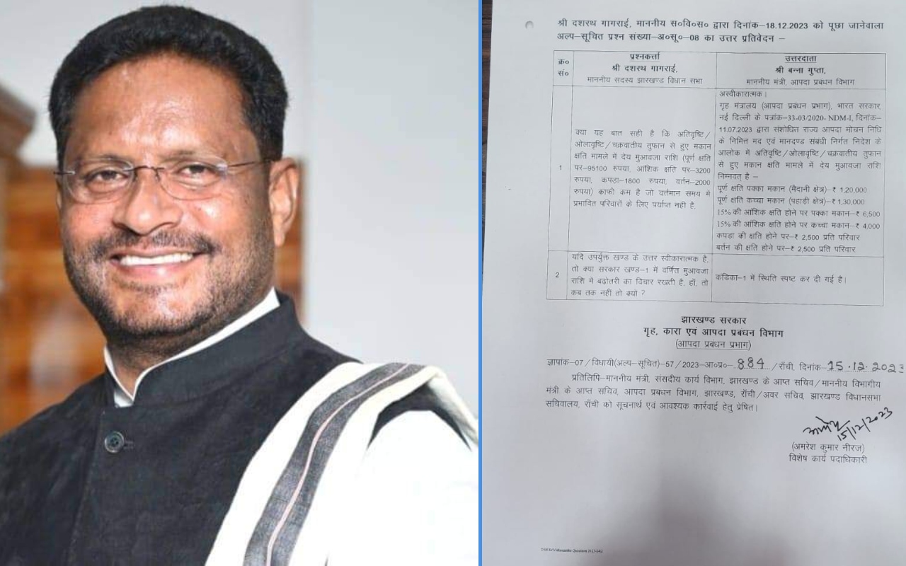 इस पर सरकार के गृह, कारा व आपदा प्रबंधन विभाग के विशेष सचिव अमरेश कुमार ने अपने लिखित उत्तर में कहा है कि गृह मंत्रालय (आपदा प्रबंधन विभाग), भारत सरकार के पत्रांक 33-3/2020, एनएमडी-1, दिनांक 11.7.2023 द्वारा संशोधित राज्य आपदामोचन निधि के निमित्त मद एवं मानदंड संबंधी निर्गत निर्देश के आलोक में मुआवजा राशि तय किया गया है. अतिवृष्टि, ओलावृष्टि व चक्रवातीय तुफान में मैदानी क्षेत्र में मकान के पूर्ण क्षति होने पर 1.20 लाख रुपये व पाहाड़ी क्षेत्रों में कच्चा मकान के पूर्ण क्षति होने पर 1.30 लाख रुपये, पक्का मकान में 15 फिसदी की आंशिक क्षति होने पर 6500 रुपये, कच्चा मकान के 15 फिसदी की आंशिक क्षति होने पर 4000 रुपये, कपड़ा व वर्तन की क्षति होने पर प्रति परिवार ढ़ाई-ढ़ाई हजार रुपये का मुआवजा मिलेगा.