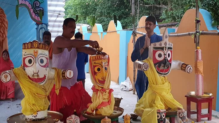 हरिभंजा के जगन्नाथ मंदिरों में पुरोहित पंडित प्रदीप कुमार दाश व पंडित भरत त्रिपाठी ने कोविड-19 को लेकर जारी निर्देशों का अनुपालन करते हुए सभी रश्मों को निभाया. यजमान के रूप में हरिभंजा के जमीनदार विद्या विनोद सिंहदेव ने पुरोहितों के साथ प्रभु जगन्नाथ, बलभद्र व देवी सुभद्रा का 108 कलश पानी से महास्नान कराया गया. प्रभु जगन्नाथ को 35 कलश, बडे भाई बलभद्र को 42 कलश, बहन सुभद्रा को 20 कलश व सुदर्शन को 11 कलश पानी से सोशल डिस्टैंसिंग बना कर स्नान कराया गया.