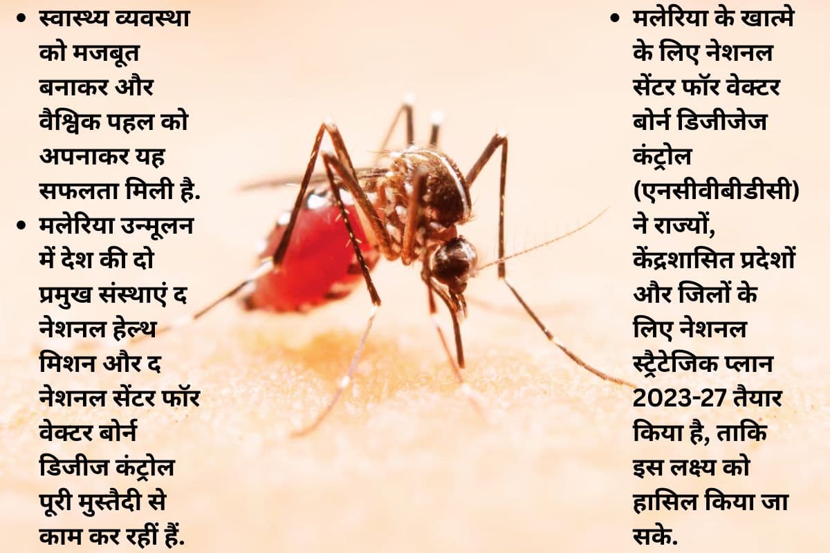 - मलेरिया के खात्मे के लिए नेशनल सेंटर फॉर वेक्टर बोर्न डिजीजेज कंट्रोल (एनसीवीबीडीसी) ने राज्यों, केंद्रशासित प्रदेशों और जिलों के लिए नेशनल स्ट्रैटेजिक प्लान 2023-27 तैयार किया है, ताकि इस लक्ष्य को हासिल किया जा सके.