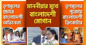 दूसरी तरफ मां काली की तस्वीर के पास मास्क लगाये कुछ लोग खड़े हैं. उसके ऊपर लिखा है, ‘तृणमूल की पूजा में बांग्लादेशी क्रिकेटर.’ बांग्लादेशी अभिनेत्री और क्रिकेटर के बीच में ममता बनर्जी की एक तस्वीर लगी है, जिसके ऊपर लिखा है, ‘माननीया के मुंह से बांग्लादेशी स्लोगन’. और अंत में दिलीप घोष के इस पोस्ट में लिखा गया है, ‘माननीया की लड़ाई का उद्देश्य ग्रेटर बांग्लादेश.’