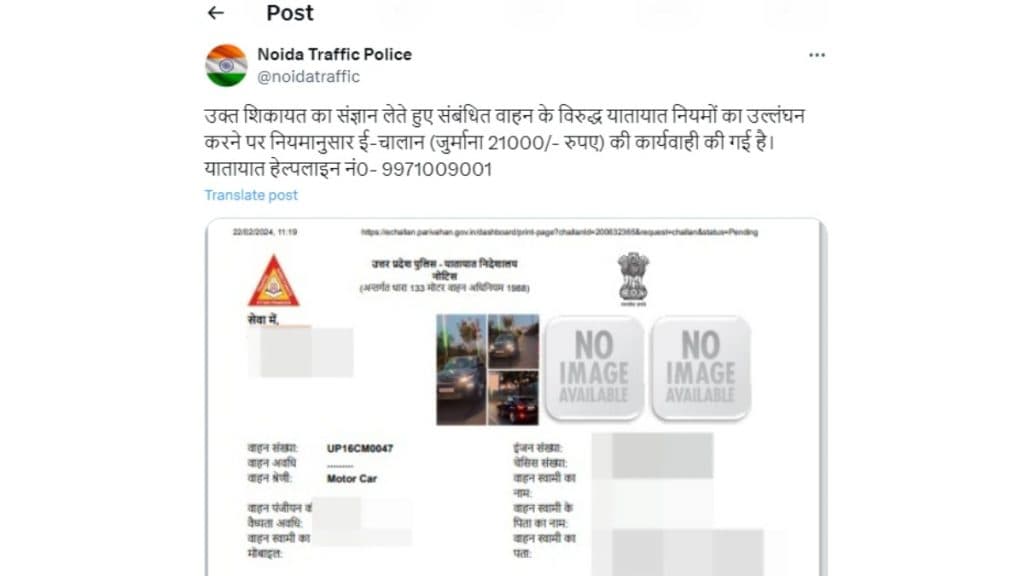 नोएडा पुलिस हरकत में आई और ट्रैफिक पुलिस विभाग ने खतरनाक ड्राइविंग, टिंटेड ग्लास और सीट बेल्ट का उपयोग न करने सहित पांच से अधिक उल्लंघनों के लिए जुर्माना लगाया है और चालान भी जारी किया है. नोएडा ट्रैफिक पुलिस ने सेशल मीडिया प्लेटफॉर्म एक्स ( पुराना नाम ट्विटर ) पर लिखा, “उपरोक्त शिकायत का संज्ञान लेते हुए, यातायात नियमों के उल्लंघन के लिए संबंधित वाहन के खिलाफ ई-चालान (21,000 रुपये जुर्माना) जारी कर कार्रवाई की गई है. ट्रैफिक हेल्पलाइन नंबर- 9971009001.” आपको जानकारी के लिए बता दें कि पुलिस ने मोटर वाहन अधिनियम, 1988 के तहत 22 फरवरी को चालान जारी किया था.