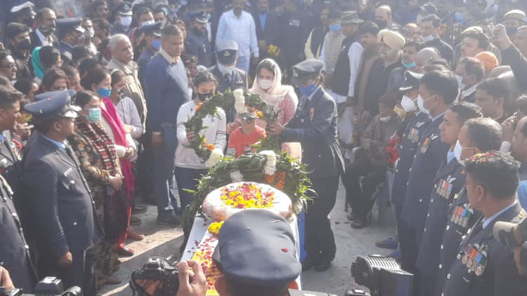 Agra News: तमिलनाडु के कुन्नूर में हुए हेलिकॉप्टर हादसे में ताजनगरी के विंग कमांडर पृथ्वी सिंह चौहान शहीद हो गए. उनका पार्थिव शरीर ताजगंज स्थित श्मशान घाट पर शनिवार करीब 2:45 बजे पंचतत्व में विलीन हो गया. शनिवार सुबह करीब 10:00 बजे विंग कमांडर का पार्थिव शरीर खेरिया हवाई अड्डे पर पहुंचा, जहां उन्हें राजकीय सम्मान दिया गया. इसके बाद एयरफोर्स के विशेष वाहन में उनका पार्थिव शरीर न्यू आगरा स्थित आवास पर पहुंचा.