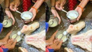 अलीगढ़ में चमत्कार या अंधविश्वास! नंदी की मूर्ति पी रही दूध, मंदिर पर दूध-कटोरी और चम्मच लेकर उमड़े श्रद्धालु