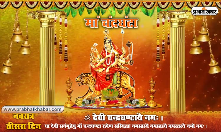 नवरात्रि के तीसरे दिन दुर्गाजी के तीसरे रूप चंद्रघंटा देवी के वंदन, पूजन और स्तवन करने का विधान है. इनके शरीर का रंग स्वर्ण के समान चमकीला और वाहन सिंह है. इस देवी के दस हाथ माने गए हैं और ये कमल, धनुष, बाण, खड्ग, कमंडल, तलवार, त्रिशूल और गदा आदि जैसे अस्त्र और शस्त्र से सुसज्जित है, इनके कंठ में श्वेत पुष्प की माला और शीर्ष पर रत्नजड़ित मुकुट है. माता चंद्रघंटा युद्ध की मुद्रा में विराजमान रहती है और साधना में मणिपुर चक्र को नियंत्रित करती हैं. मां दुर्गा का पहला शैलपुत्री और दूसरा ब्रह्मचारिणी स्वरूप भगवान शंकर को प्राप्त करने के लिए है, जब माता भगवान शंकर को पति रूप में प्राप्त कर लेती हैं तब वह आदिशक्ति के रूप में प्रकट होती है और चंद्रघंटा बन जाती हैं. देवी पार्वती के जीवन में तीसरी सबसे बड़ी घटना के रूप में उनको प्रिय वाहन वाघ प्राप्त होता है. इसलिए माता बाघ पर सवार होकर भक्तों को अभयता प्रदान करती है.