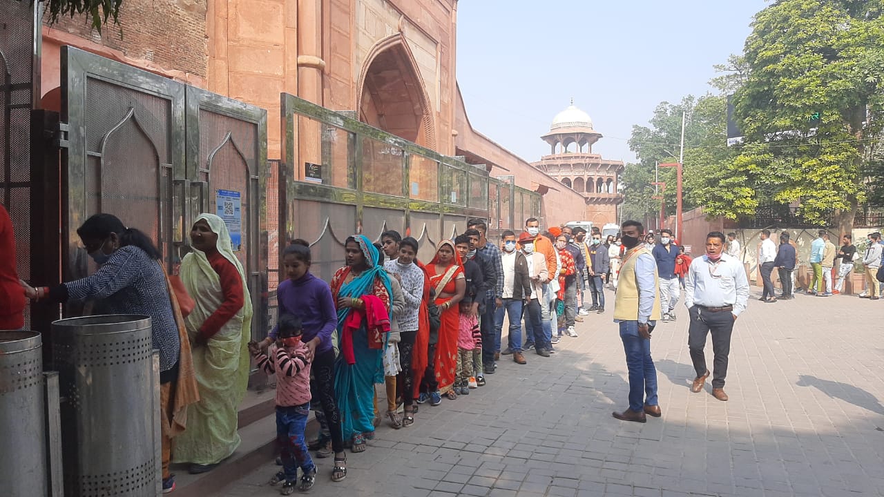 ताजमहल के पूर्वी और पश्चिमी द्वार पर सैलानियों की लंबी लंबी कतारें नजर आई. वहीं एएसआई कर्मचारियों द्वारा लोगों को कोविड गाइडलाइन का पालन करने की सलाह दी जा रही थी लेकिन फिर भी लोग बिना मास्क और सोशल डिस्टेंसिंग के ताजमहल का दीदार करने के लिए उत्सुक दिखाई दिए.