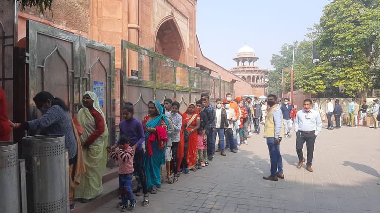 ताजमहल के पूर्वी और पश्चिमी द्वार पर सैलानियों की लंबी लंबी कतारें नजर आई. वहीं एएसआई कर्मचारियों द्वारा लोगों को कोविड गाइडलाइन का पालन करने की सलाह दी जा रही थी लेकिन फिर भी लोग बिना मास्क और सोशल डिस्टेंसिंग के ताजमहल का दीदार करने के लिए उत्सुक दिखाई दिए.