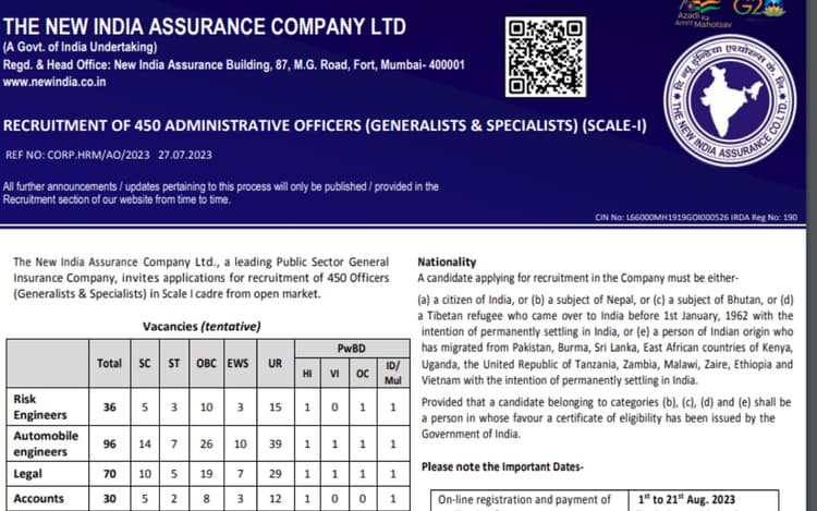 एनआईएसीएल एओ भर्ती 2023 रिक्ति विवरण: यह भर्ती अभियान स्केल I कैडर में 450 प्रशासनिक अधिकारियों (सामान्यज्ञ और विशेषज्ञ) की 450 रिक्तियों को भरने के लिए चलाया जा रहा है.