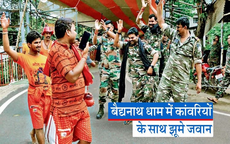 सावन महीने में बाबाधाम में श्रद्धालुओं का हुजूम उमड़ रहा है. हर कदम बाबा मंदिर की ओर बढ़ रहे हैं. इसी दौरान नंदन पहाड़ के पास भक्तिमय संगीत के साथ झूमते कांवरियों को देख सुरक्षा व्यवस्था में तैनात जवान भी झूमने लगे. इससे पूरा माहौल भक्तिमय हो गया.