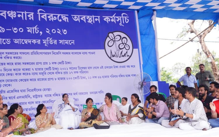 कोलकाता. पंचायत चुनाव से पहले पश्चिम बंगाल में सियासी सरगर्मी बढ़ गयी है. पश्चिम बंगाल की मुख्यमंत्री ममता बनर्जी रेड रोड पर डॉ बीआर आंबेडकर की प्रतिमा के समक्ष तृणमूल कांग्रेस के नेताओं एवं कार्यकर्ताओं के साथ बुधवार को रातभर धरने पर बैठी रहीं. पश्चिम बंगाल के प्रति केंद्र सरकार के कथित भेदभावपूर्ण रवैये के विरोध में वे कोलकाता में दो दिवसीय धरने पर बैठी हैं. इनके साथ फरहाद हकीम और अरूप बिस्वास सहित पार्टी के कई नेता धरने में शामिल हुए.