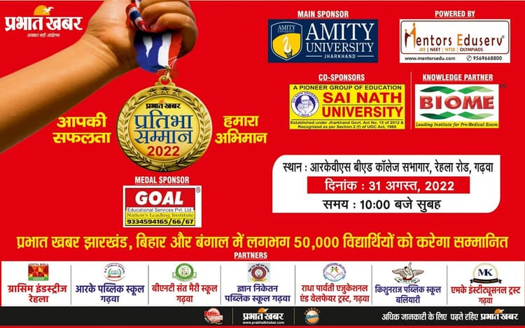 Jharkhand News : प्रभात खबर के द्वारा गढ़वा रेहला मार्ग पर स्थित आरकेवीएस बीएड कॉलेज में 31 अगस्त को प्रतिभा सम्मान समारोह का आयोजन किया गया है. इसमें झारखंड जैक बोर्ड के मैट्रिक टॉपर, इंटर टॉपर सहित सीबीएसई बोर्ड के मैट्रिक, इंटर सहित प्रतियोगिता परीक्षाओं में बेहतर प्रदर्शन करने वाले छात्र-छात्राओं को भी सम्मानित किया जाएगा.