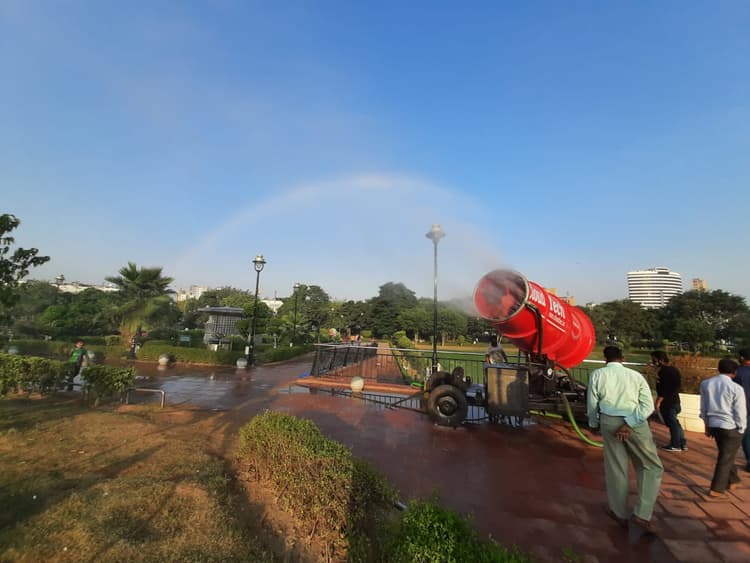 दिल्ली के सेंट्रल पार्क में जब पॉल्युशन को कम करने के लिए पानी का छिड़काव किया गया तो आसमान सतरंगी रंग में रंग गया.