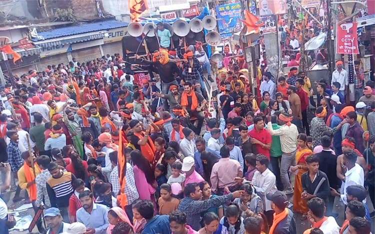 हजारीबाग, शंकर प्रसाद : हजारीबाग में रामनवमी दशमी जुलूस को लेकर आज शनिवार 01 अप्रैल की सुबह हजारीबाग के सड़कों पर राम भक्तों की भीड़ उमड़ पड़ी. लाखों की संख्या में राम भक्त जुलूस में ढोल ताशा के धुन पर नाचते गाते लाठी तलवार भाला का करतब दिखाते नजर आयें. वहीं, जिला प्रशासन पुलिस प्रशासन की निगरानी में जुलूस को शांति पूर्वक बढ़ाने में सहयोग किया.