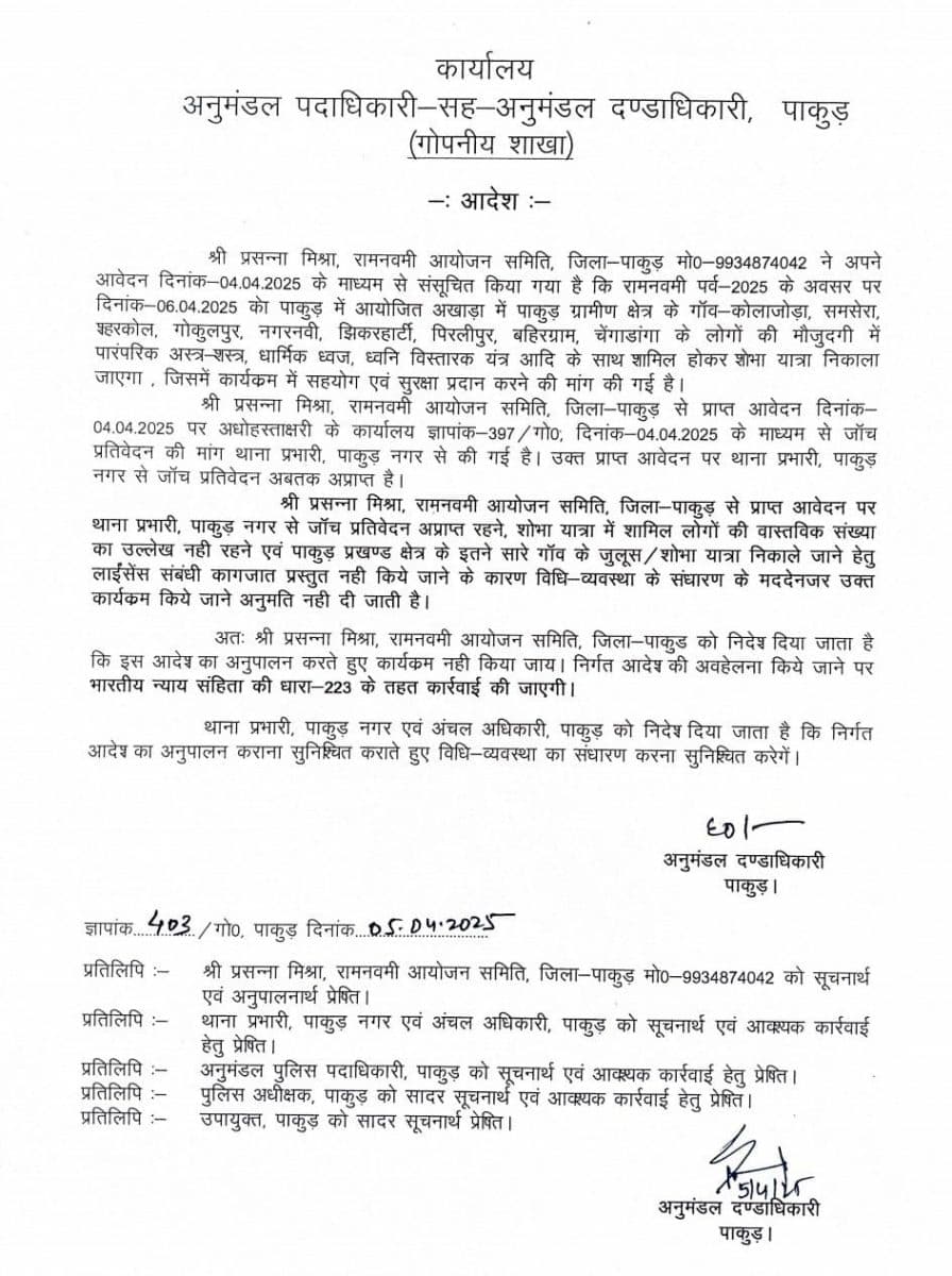 एसडीओ कार्यालय से 5 अप्रैल 2025 को जारी ज्ञापांक संख्या 403 में कहा गया है कि रामनवमी आयोजन समिति पाकुड़ से मिलने आवेदन में यह नहीं बताया गया है कि शोभायात्रा में कितने लोग शामिल होंगे. साथ ही लाइसेंस संबंधी कागजात भी प्रस्तुत नहीं किया गया. इसलिए रामनवमी आयोजन समिति को कार्यक्रम की अनुमति नहीं दी जायेगी.