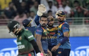 अगले ओवर में चमिका करुणारत्ने की उछाल लेती गेंद पर मुशफिकुर रहीम (चार रन) विकेटकीपर मेंडिस को कैच देकर आउट हुए. कम होती रन गति को पटरी पर लाने के लिए कप्तान शाकिब अल हसन ने जोखिम उठाकर नौवें और 10वें ओवर में चार गेंद पर तीन चौके जड़े. तीक्षना ने 11वें ओवर में उन्हें बोल्ड करके उनकी पारी को खतरनाक होने से पहले ही रोक दिया.
