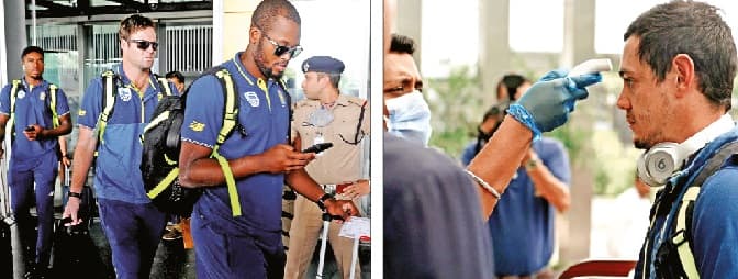दक्षिण अफ्रीका टीम के पूर्व कप्तान फाफ डुप्लेसिस समेत कुछ खिलाड़ियों ने अपने चेहरे पर मास्क लगा रखा था. खिलाड़ी एयरपोर्ट से टीम की बस में चढ़ कर सीधे होटल के लिए रवाना हो गये.
