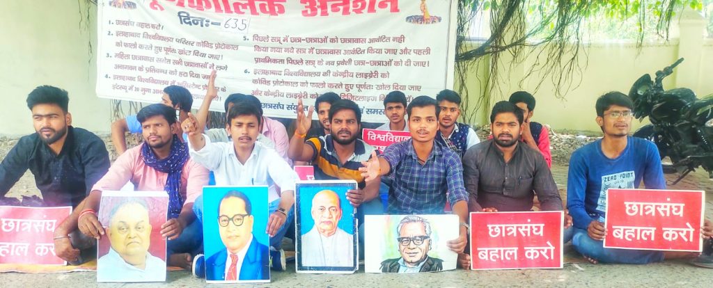 इलाहाबाद यूनिवर्सिटी में अनशन पर बैठे छात्र, मांग- बीए तृतीय वर्ष के ऑनलाइन एग्जाम की डेट घोषित हो