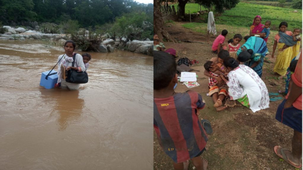 पीठ पर बेटी, हाथ में वैक्सीन कंटेनर लिए नदी पार कर बच्चों के टीकाकरण में जुटी लातेहार की ANM मानती कुमारी