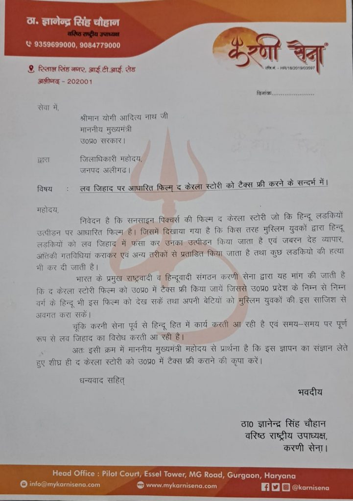 करणी सेना ने 'द केरला स्टोरी 'फिल्म को लेकर मुख्यमंत्री योगी आदित्यनाथ को संबोधित ज्ञापन जिलाधिकारी इन्द्र विक्रम सिंह को सौंपा है.