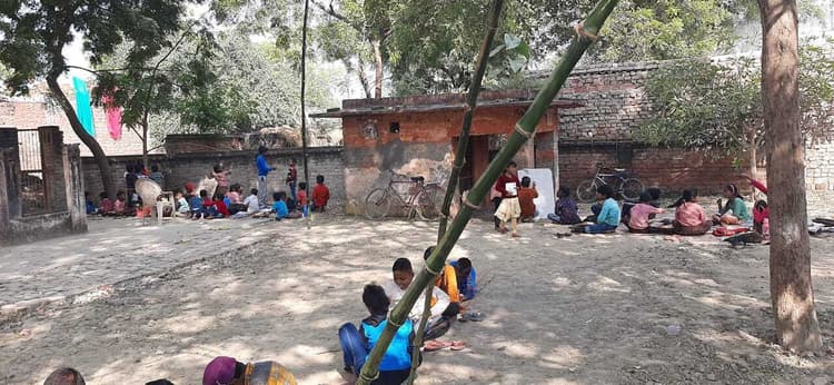 बनारस का बेसिक शिक्षा विभाग जहां स्मार्ट स्कूल और अत्याधुनिक स्मार्ट क्लासेज पर इतराता है तो कई पुराने, तो कई भवन विहीन स्कूल सुंदरता पर पैबंद लगा रहे हैं. चोलापुर ब्लॉक 6 में स्कूल है, जहां एक साल से बच्चे खुली छत के नीचे पढ़ रहे हैं. दिसंबर 2020 में गिराया गया भवन एक साल बाद भी बनकर तैयार नहीं हो सका. इस कारण बच्चे स्कूल में खुले आसमान के नीचे बैठकर पढ़ाई कर रहे हैं.