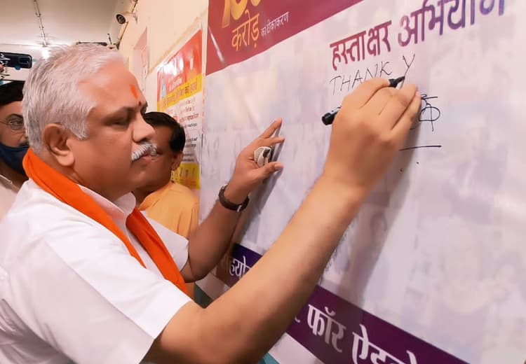 Varanasi News: भारत कोरोना टीकाकरण में नए रिकॉर्ड बना रहा है. गुरुवार को भारत ने कोविड-19 वैक्सीन के 100 करोड़ डोज लगाने का रिकॉर्ड बनाया. वाराणसी के दुर्गाकुंड शहरी सामुदायिक स्वास्थ्य केंद्र में स्वास्थ्य एवं परिवार कल्याण विभाग ने सेंटर फॉर एडवोकेसी एंड रिसर्च (सीफार) के सहयोग से हस्ताक्षर अभियान का आयोजन किया गया. इसका उद्घाटन बीजेपी राष्ट्रीय महामंत्री (संगठन) बीएल संतोष ने थैंक यू इंडिया लिखते हुए किया. इसके साथ मुख्य चिकित्सा अधिकारी समेत अन्य चिकित्सा अधिकारियों और कर्मचारियों को कोविड योद्धा के रूप में भी सम्मानित किया गया.
