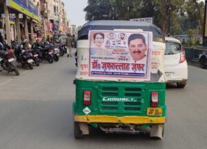 कचहरी से कैंट रेलवे स्टेशन जा रहे एक ऑटो के पीछे एक पार्टी का बैनर लगा दिखा. जगह-जगह ट्रैफिक पुलिसकर्मी भी तैनात दिखे. लेकिन, ऑटो को रोककर किसी ने बैनर उतरवाने की जहमत नहीं उठाई.