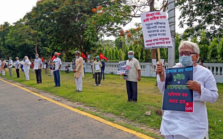 माकपा विधायक दल के नेता सुजन चक्रवर्ती ने कहा, ‘हम यहां प्रदर्शन करने आये हैं, क्योंकि राज्य के कई हिस्सों में गरीब लोगों को राशन नहीं मिल रहा है और वे भूखे मर रहे हैं. राज्य सरकार की केवल मुद्दा छिपाने में रुचि है. हम चाहते हैं कि समस्या का समाधान करने के लिए प्रशासन तत्काल कदम उठाये और हर व्यक्ति तक राशन सुनिश्चित करे.’