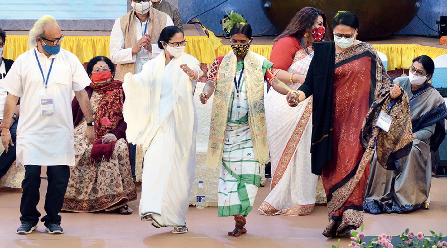 पश्चिम बंगाल की मुख्यमंत्री एवं तृणमूल कांग्रेस सुप्रीमो ममता बनर्जी गुरुवार को मंच पर महिलाओं एवं अन्य कलाकारों के साथ नाचने लगीं. इस पर लोगों ने कहा कि वोट के लिए इनसे कुछ भी करवा लो. मौका था राजधानी कोलकाता में बांग्ला संगीत मेला 2020 के उद्घाटन का. आदिवासी महिला कलाकार के साथ ममता बनर्जी खड़ी हुईं, तो मंच पर मौजूद अन्य अतिथि भी खड़े हो गये. फिर सब मिलकर ममता बनर्जी के साथ नाचने लगे.