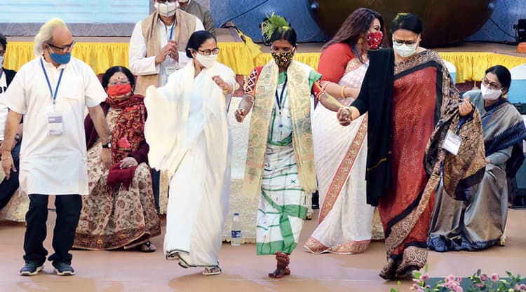 कोलकाता : पश्चिम बंगाल की मुख्यमंत्री एवं तृणमूल कांग्रेस सुप्रीमो ममता बनर्जी गुरुवार को मंच पर महिलाओं एवं अन्य कलाकारों के साथ नाचने लगीं. इस पर लोगों ने कहा कि वोट के लिए इनसे कुछ भी करवा लो. मौका था राजधानी कोलकाता में बांग्ला संगीत मेला 2020 के उद्घाटन का. आदिवासी महिला कलाकार के साथ ममता बनर्जी खड़ी हुईं, तो मंच पर मौजूद अन्य अतिथि भी खड़े हो गये. फिर सब मिलकर ममता बनर्जी के साथ नाचने लगे.