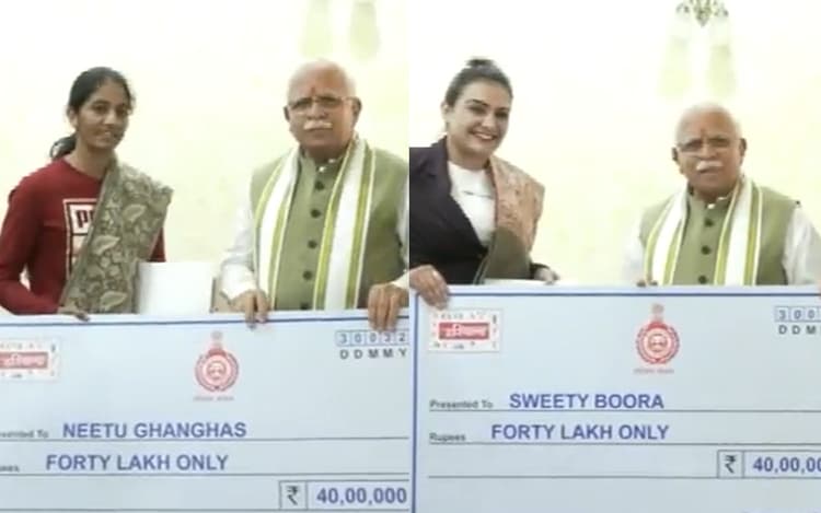 हरियाणा के सीएम खट्टर ने गुरुवार को चंडीगढ़ में स्थित अपने आवास संत कबीर कुटीर में नीतू और स्वीटी से भेंट की. सीएम ने प्रत्येक को 40 लाख रुपये का चेक सौंपा और दोनों खिलाड़ियों को हरियाणा उत्कृष्ट खिलाड़ी सेवा नियम के तहत ग्रुप बी की नौकरी का ऑफर लेटर दिया. दोनों खिलाड़ी इस सम्मान को पाकर काफी खुश दिखीं. सीएम ने दोनों विश्व चैंपियन बेटियों को उनकी इस उपलब्धि के लिए बधाई देते हुए उनके उज्जवल भविष्य की कामना की.