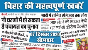 Bihar News, Patna, Bhagalpur, Gaya, Muzzaffarpur, Corona Vaccine, Panchayat Election 2021, Wedding New Guidelines: आम लोगों को मतदान केंद्रों पर लगेगी कोरोना वैक्सीन (Corona Vaccine). स्वास्थ्य विभाग ने इसे लेकर तैयारी शुरू कर दी है. इधर, नौ चरणों में होगा पंचायत चुनाव. वहीं, शादी समारोह में अब 200 लोग शामिल हो पायेंगे. आपको बता दें कि किसान आंदोलन पर राज्य में सियासत गरमा चुकी है. आठ को भारत बंद का राजद, कांग्रेस व वाम दल का समर्थन मिल चुका है. आइये देखते हैं राज्य की ऐसी अन्य महत्वपूर्ण खबरें जो बनीं अखबारों की सुर्खियां...