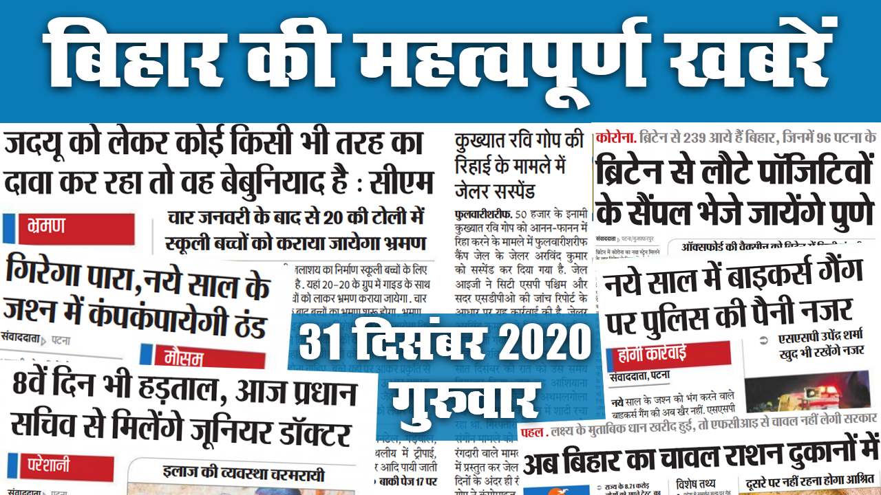 Bihar News, Corona Vaccine, Weather Update, Patna, Bhagalpur, Gaya, Muzzaffarpur, Weather Update, New Year 2021: नये साल के जश्न में ठंड और कंपकपायेगी. राज्य का पारा और गिरने वाला है. आठवें दिन भी जारी रही हड़ताल, आज प्रधान सचिव से मिलेंगे जूनियर डाॅक्टर. ब्रिटेन से लौटे पॉजिटीवों के सैंपल भेजे जायेंगे पुणे. नये साल में बाइकर्स गैंग पर पैनी रहेगी पुलिस की नजर. आइये देखते हैं राज्य की अन्य महत्वपूर्ण खबरें जो बनीं अखबार की सुर्खियां..