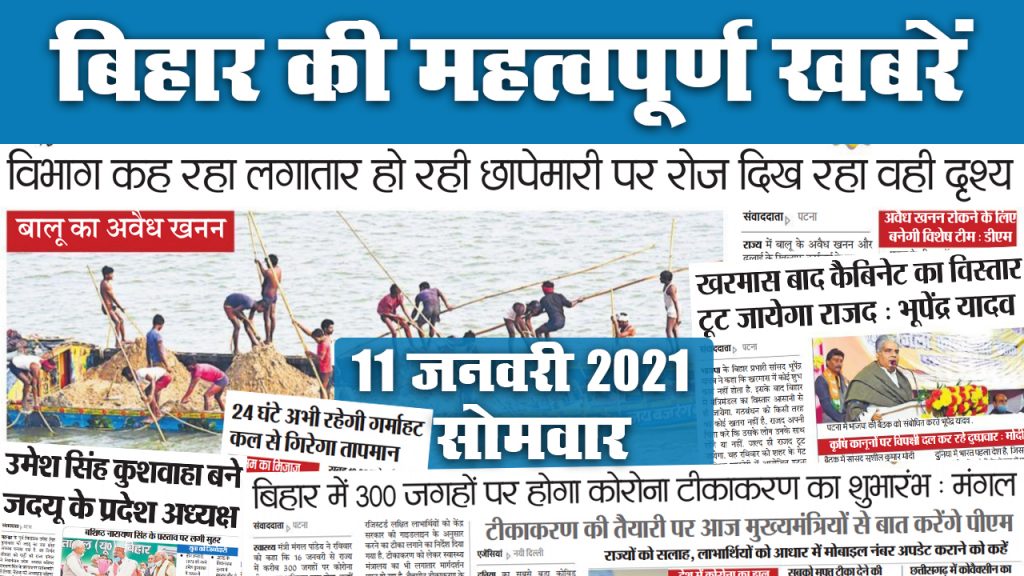Bihar News, Patna, Bhagalpur, Gaya, Muzzaffarpur, Corona Vaccination Update, Weather Update: जेपी सेतु, कंगन घाट और पहलेजा घाट अब होंगे पटना जिला के हिस्से. बिहार से राजस्थान भेजे जा रहे बच्चे, बाल श्रम का है मामला. हर परिवार को पानी के लिए देने होंगे 30 रुपये प्रति माह. आज भागलपुर समेत पटना व अन्य जिले में पहुंचेगी कोरोना वैक्सीन की पहली खेप. 16 को होगा वैक्सीनेशन. अब पटना पटना में 30 सितंबर तक चलेंगे डीजल वाले ऑटो. कांग्रेस की बैठक में फाड़े गए कपड़े, मंच पर चली कुर्सियां. राजद के 10-12 जिला अध्यक्षों पर गिर सकती है गाज…