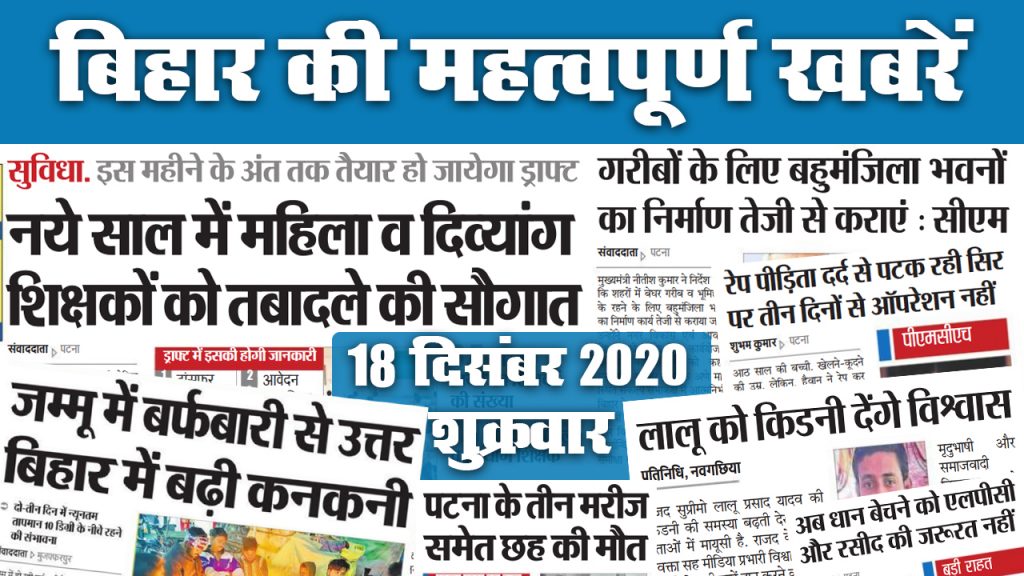 Bihar News, Corona Vaccine, Weather Update, Patna, Bhagalpur, Gaya, Muzzaffarpur, Weather Update, New Year 2021, Happy Christmas 2020: ऑड-इवेन रोल नंबर से स्कूल आयेंगे बच्चे. स्कूल आने के लिए अभिभावकों की सहमति जरूरी. Arts, कॉमर्स के छात्र कर पायेंगे BSC Nursing का कोर्स. जूनियर डॅाक्टर के हड़ताल ने बढ़ायी परेशानी. कहीं इलाज नहीं मिला तो कहीं बच्चे की हुई मौत. राज्य में शीतलहर गायब अब गुलाबी ठंड शुरू. आइये देखते हैं राज्य की अन्य महत्वपूर्ण खबरें जो बनीं अखबार की सुर्खियां. जानें राज्य में क्रिसमस, वेदर और कोरोना वायरस व कोरोना वैक्सीन को लेकर क्या है अपडेट..