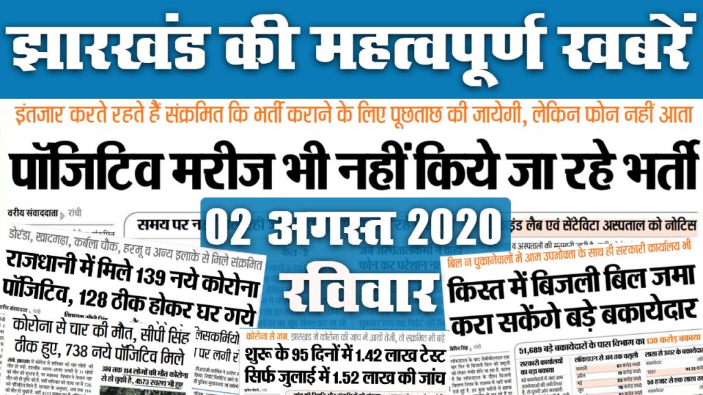 Jharkhand News, 10 September, Jivitputrika Vrat 2020, coronavirus: झारखंड में पिछले 24 घंटे में कुल 1601 नये कोरोना के मामले सामने आये हैं. जिसके बाद कोरोना संक्रमितों की कुल संख्या 56897 हो गयी है. इनमें नौ संक्रमितों की मौत हो गयी है. मरनेवालों का कुल आंकड़ा 512 हो गया है. जबकि, राज्य में अब तक 40659 संक्रमित स्वस्थ भी हुए है. इधर, 14 दिन की बच्ची की सर्जरी भी हुई और उसने कोरोना को भी हराया है. दरअसल, आंत फटने के बाद बच्ची को उसके मां-बाप रिम्स ले गए थे. जहां वो कोरोना पॉजिटीव भी पायी गई. जिसके बाद उसे भगवान भरोसे छोड़ भागे उसके परिजन. आइये जानते हैं झारखंड में इसके अलावा और कौन सी खबर बनीं अखबर की सुर्खियां..