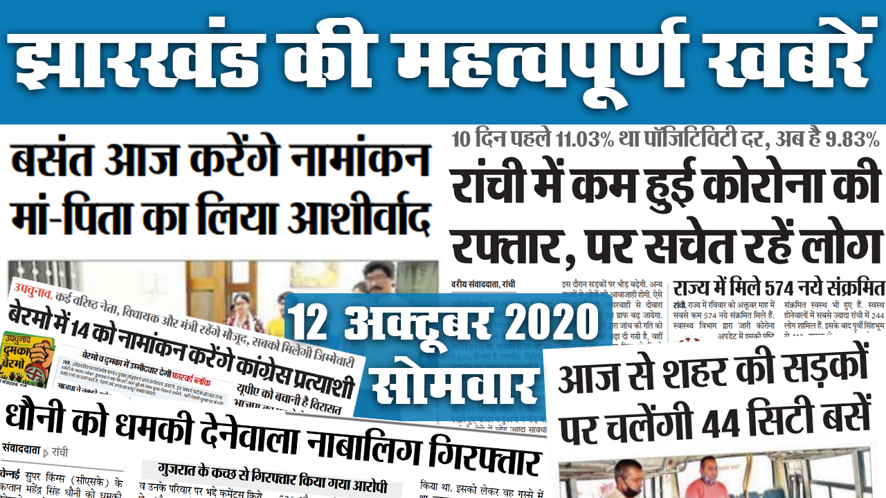 Jharkhand News, Coronavirus, Ranchi, Deoghar, Jamshedpur, Dhanbad : रांची में कोरोना की रफ्तार पहले के मुताबिक काफी कम हुई है. हालांकि, लोगों को अब भी सचेत रहने की जरूरत है. इसी बीच आज से रांची की सड़कों पर चलेंगी 44 सिटी बसें. इधर, धौनी को धमकी देने वाला नाबालिग गिरफ्तार कर लिया गया है. राज्य में उपचुनाव को लेकर बसंत सोरेन आज नामांकन करने वाले है. 14 को बेरमो में कांग्रेस प्रत्यासी भी नामांकन करेंगे. आइये जानते हैं राज्य की ऐसे ही अन्य महत्वपूर्ण खबरें...