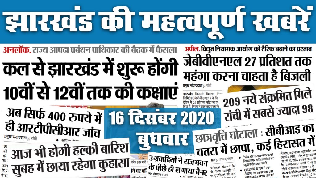 Jharkhand News, Ranchi, Deoghar, Jamshedpur, Dhanbad, School Reopen In Jharkhand: जेबीवीएनएल 27 प्रतिशत तक महंगा करना चाहता है बिजली. कल से 10वीं से 12वीं तक का School Reopen, खुलेंगी कक्षाएं. आज भी राज्य के कई हिस्सों में बारिश के आसार. अब राज्य में कोरोना टेस्ट आरटीपीसी के जरिये हुए सस्ता. 400 रुपये में होगी जांच. इधर, उग्रवादियों ने राजभवन के पीछे लगाया पोस्टर. आइये जानते हैं राज्य की ऐसी ही बड़ी खबरें जो बनीं अखबार की सुर्खियां…