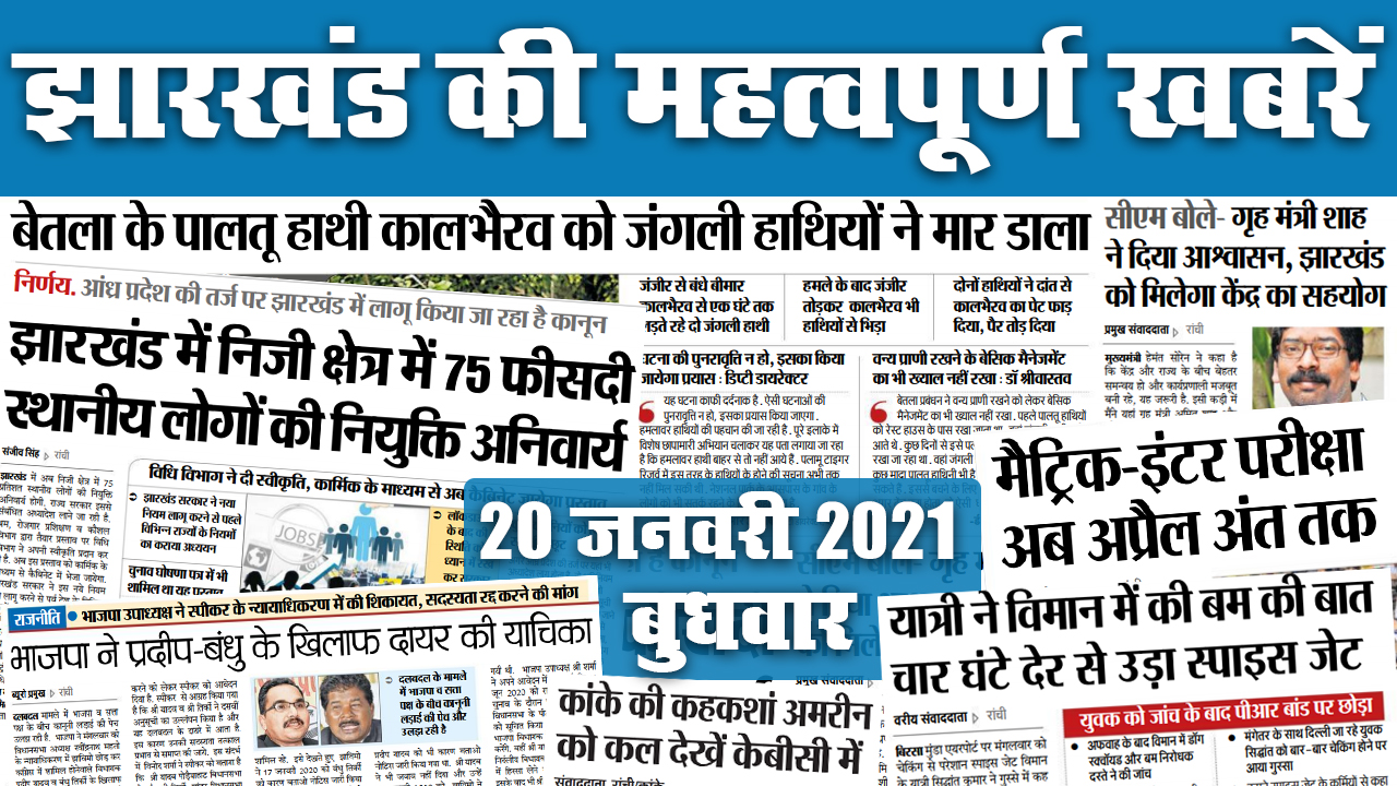 Jharkhand News, Corona Vaccination, Weather, Crime Updates: बेतला के पालतू हाथी काल भैरव को जंगली हाथियों ने मार डाला. सीएम हेमंत सोरेन ने कहा, गृह मंत्री शाह ने दिया है आश्वासन, झारखंड को मिलेगा केंद्र का सहयोग. आंध्र प्रदेश की तर्ज पर झारखंड में लागू किया जा रहा कानून, अब निजी क्षेत्र में 75 फीसदी स्थानीय लोगों को नियुक्ति होगी अनिवार्य. भाजपा ने प्रदीप बंधु के खिलाफ दायर की याचिका. मैट्रिक इंटर परीक्षा अब अप्रैल अंत तक. यात्री ने विमान में की बम की बात, 4 घंटे देर से उड़ा स्पाइसजेट. कांके की कहकशां अमरीन कल दिखेंगी केबीसी में..