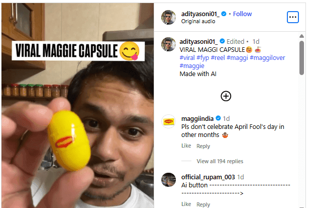 वहीं, इस मैगी कैप्सूल वाले वीडियो पर कई यूजर्स ने मजेदार कमेंट भी किया है. सबसे मजेदार तो खुद maggiindia ने भी इस वीडियो में कमेंट करते हुए लिखा है, कि ‘कृपया अप्रैल फूल दूसरे महीनों में न मनाएं.’ इसके बाद से कई यूजर्स ने भी इस पर कमेंट किया है. एक यूजर ने लिखा है, कंटेंट ऐसा बनाओ कि खुद ब्रांड को भी गुस्सा आ जाए.’ दूसरे ने कमेंट किया है कि ‘मैगी बी लाइक ये कब हुआ.’