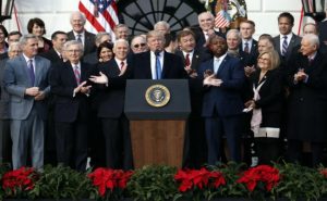 वाशिंगटन : अमेरिका के राष्ट्रपति डोनाल्ड ट्रंप ने वरिष्ठ प्रशासनिक अधिकारियों और रिपब्लिकन सांसदों के साथ कांग्रेस द्वारा पिछले 30 वर्षों में अमेरिका के सबसे बड़े कर सुधार को पारित किये जाने का जश्न मनाया. कर सुधार संबंधी यह विधेयक अब व्हाइट हाउस में राष्ट्रपति के हस्ताक्षर के लिए चला गया है, लेकिन व्हाइट हाउस ने अभी इस बात की जानकारी नहीं दी है कि राष्ट्रपति इस विधेयक पर हस्ताक्षर कब करेंगे.