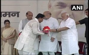 Delhi: PM Narendra Modi & BJP President Amit Shah hands over the urns carrying ashes of #AtalBihariVajpayee to Presidents of all states & union territories. The former Prime Minister's daughter Namita Bhattacharya is also present at the occasion. pic.twitter.com/sqgGm5YeSv
